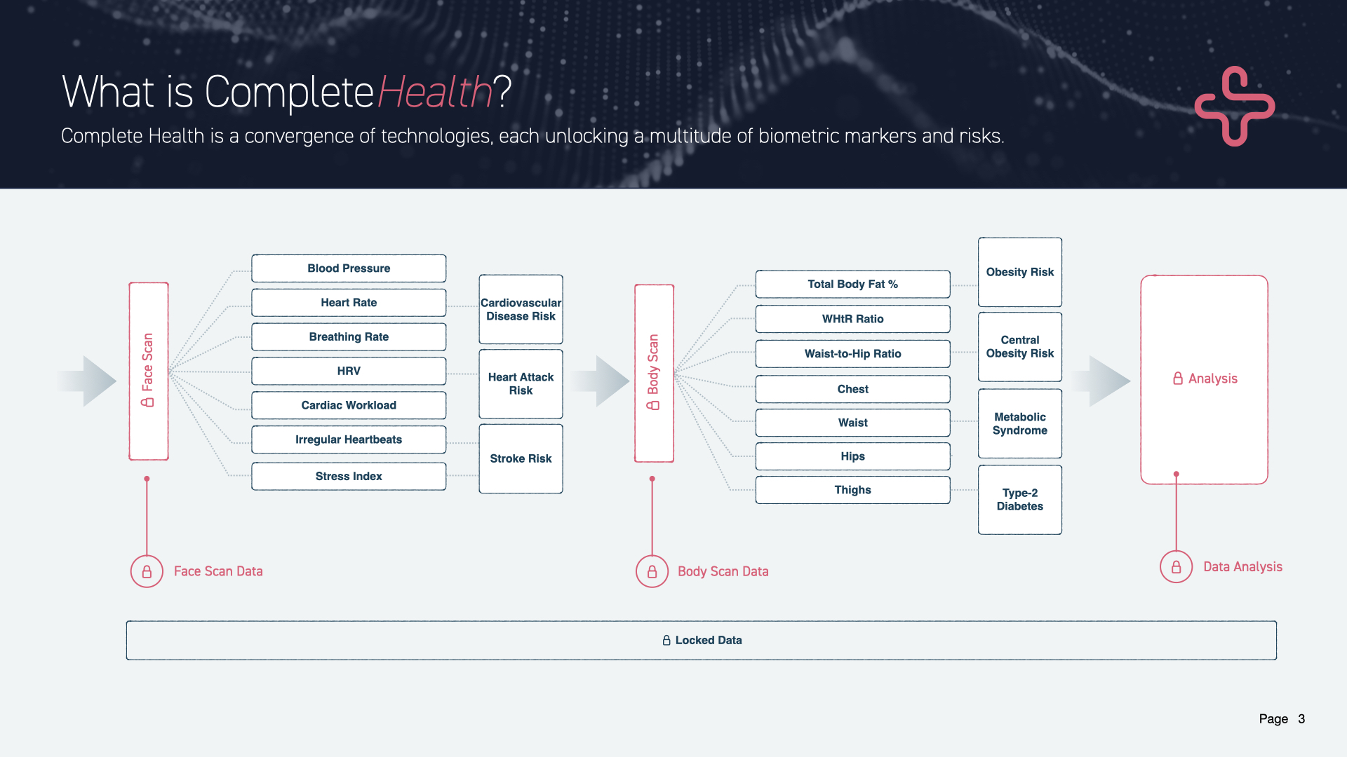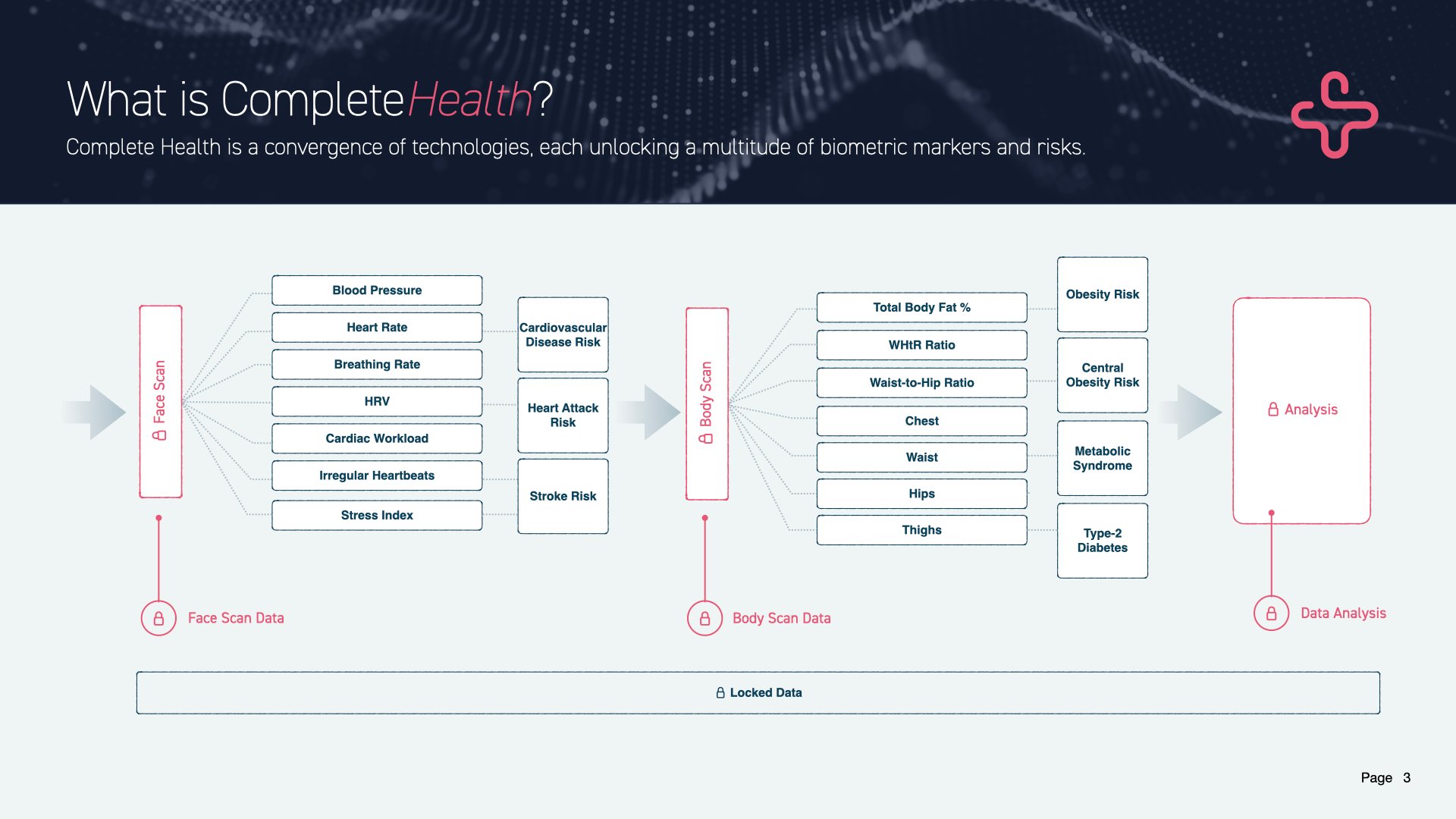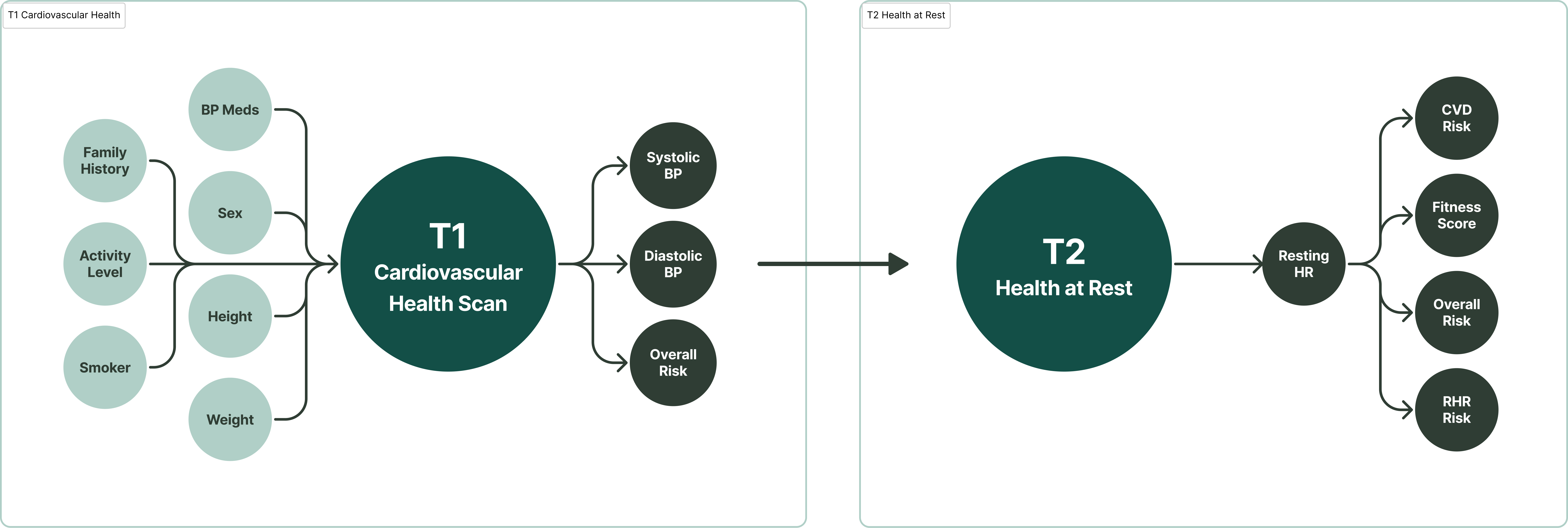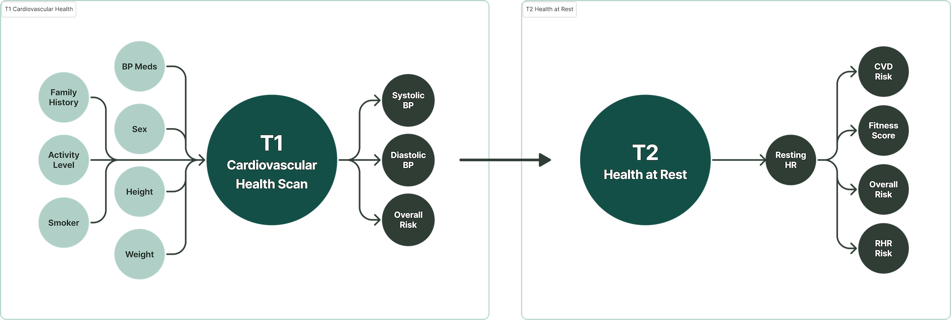 Each stage generates its own biometric data and health risks. For example, the first stage consists of a Cardiovascular Health Scan. This gives us risks for Cardiovascular Disease (CVD), Heart Attack, and Stroke (just to name a few; more on that later). These can be shown to the person as an incentive to “unlock” the body the more they progress. The low barrier to entry of a FaceScan builds trust and encourages progression through the following stages.
