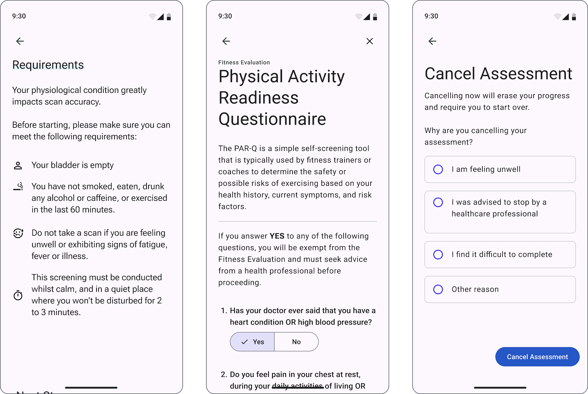 The Fitness Evaluation stage poses risks by requesting physically intensive exercises from those with health conditions. To mitigate this, a PAR-Q+ (Physical Activity Readiness Questionnaire) is administered first. This seven-question screen identifies readiness through self-reported responses. If any question is answered Yes, the user can skip the Fitness Evaluation.