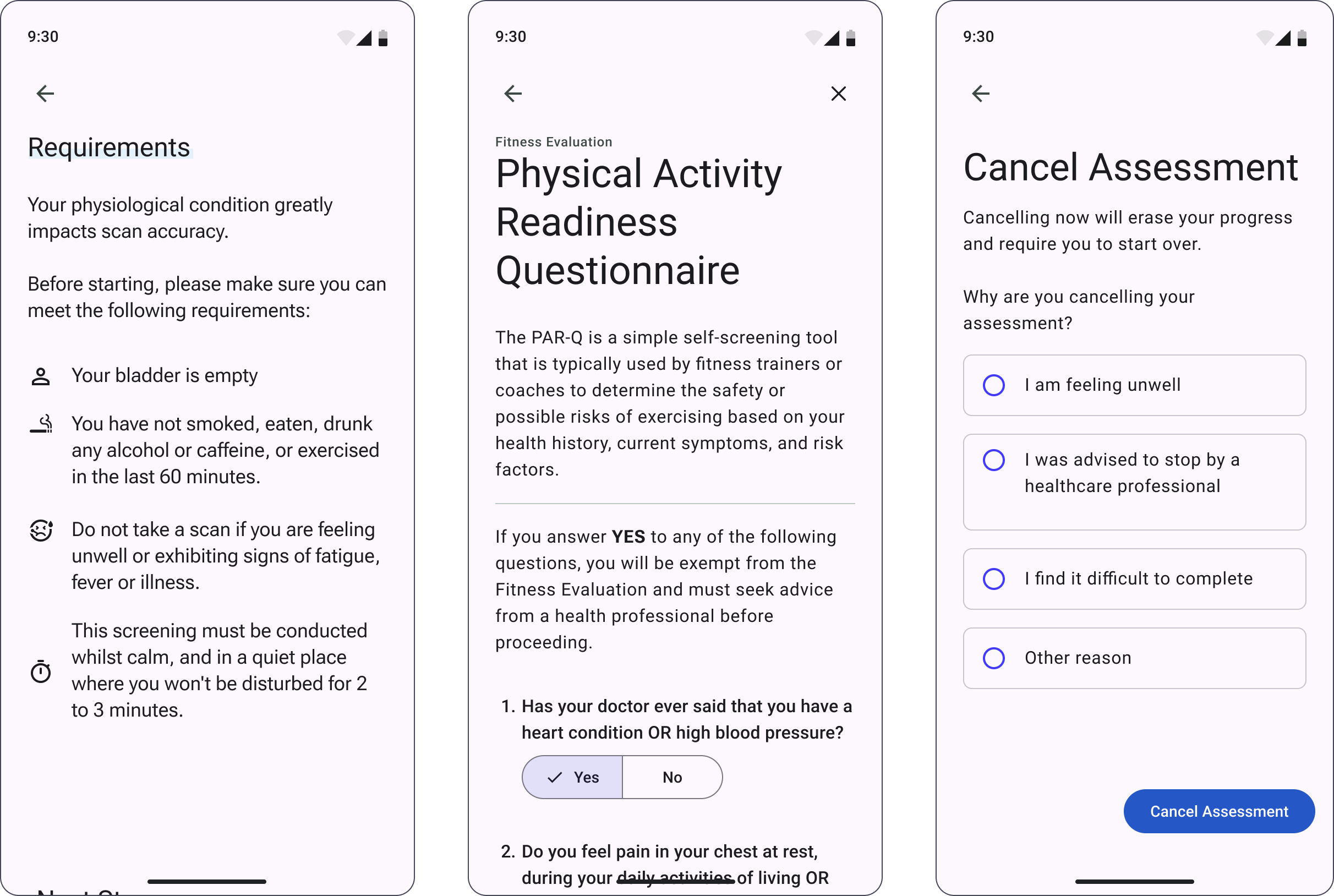 We would need to research the top 3 "Yes" answers for the PAR-Q and work them in before starting an assessment. The messaging will then be clear that users need to complete only 3 stages, a ⅓ ratio which is magical in its effect of reducing the perception of time and expectation of effort.