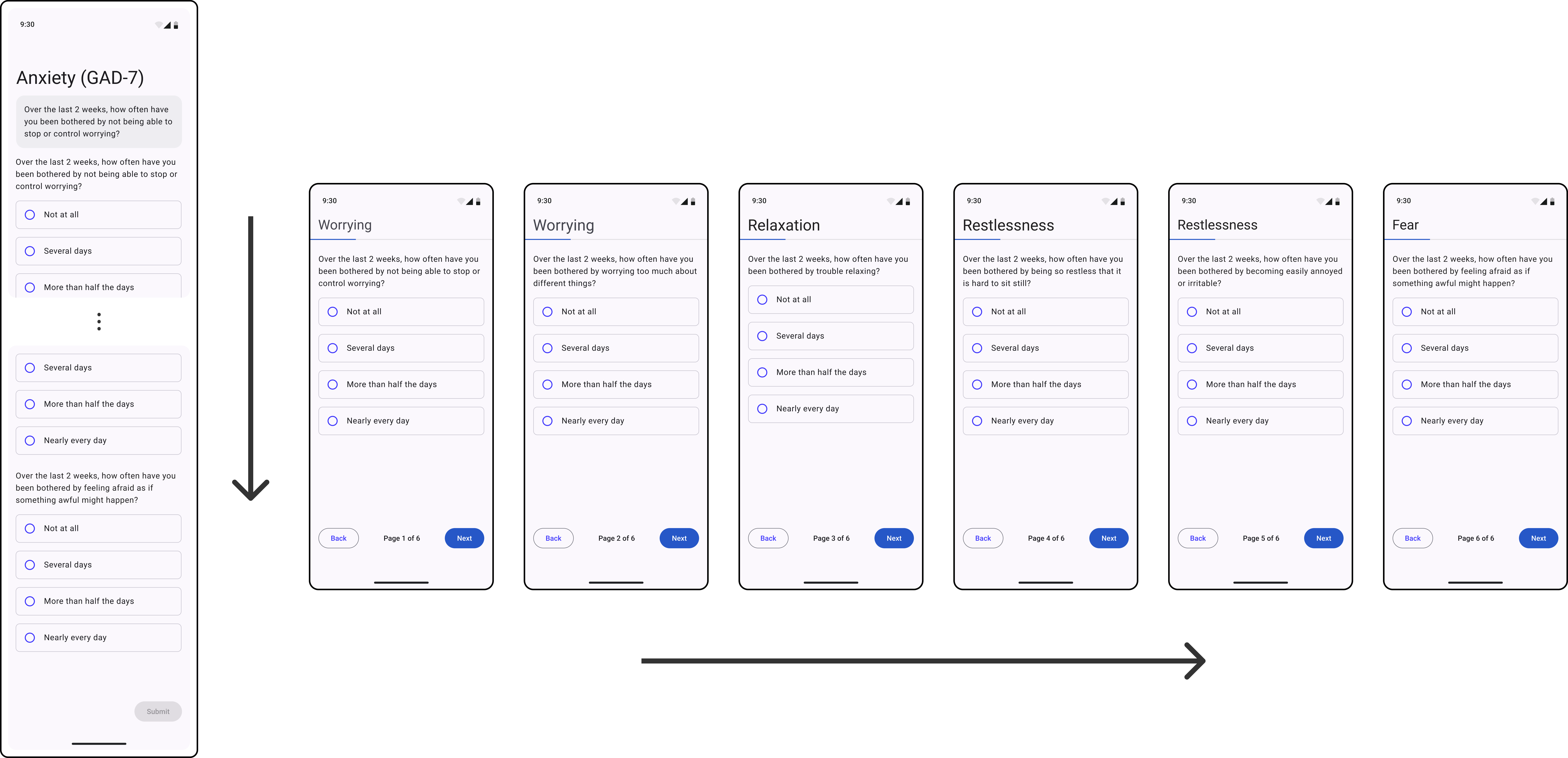 In practice, the mental health questionnaires are a direct use case for the guidelines. Here you can see a long flow of questions versus individual screens.