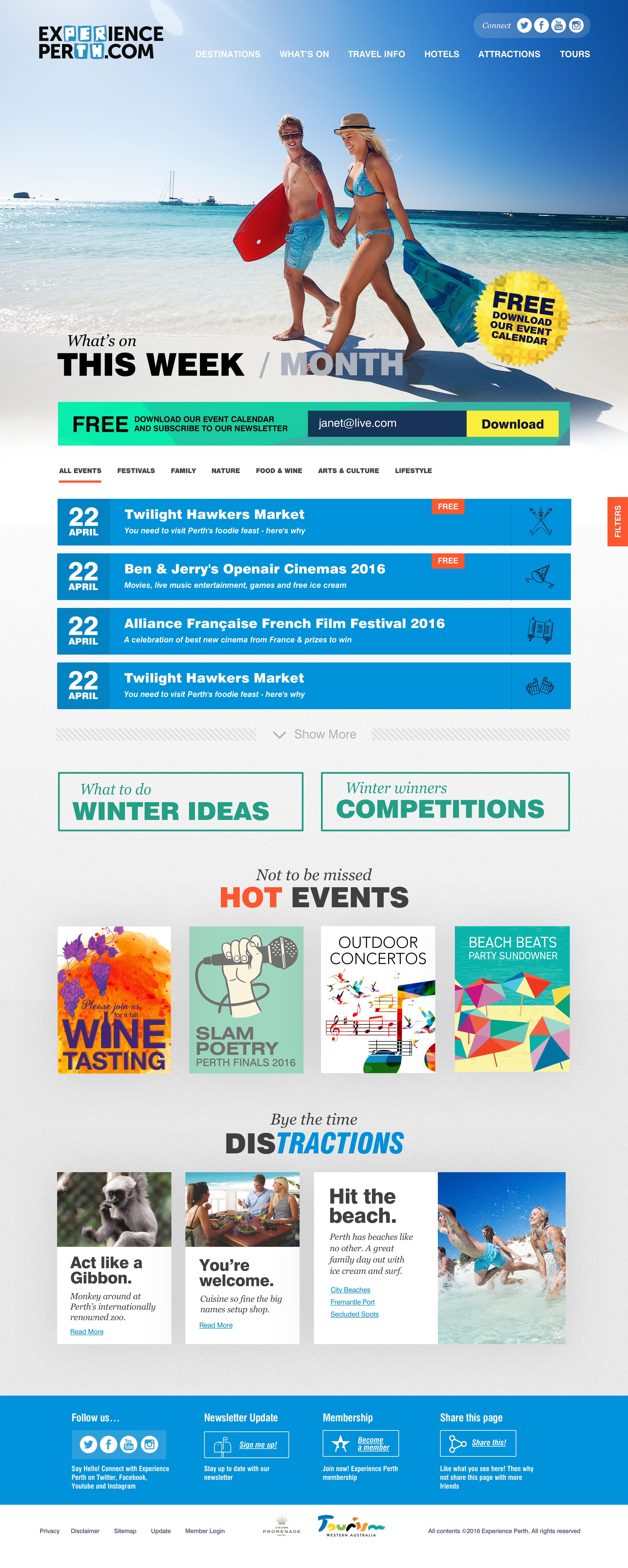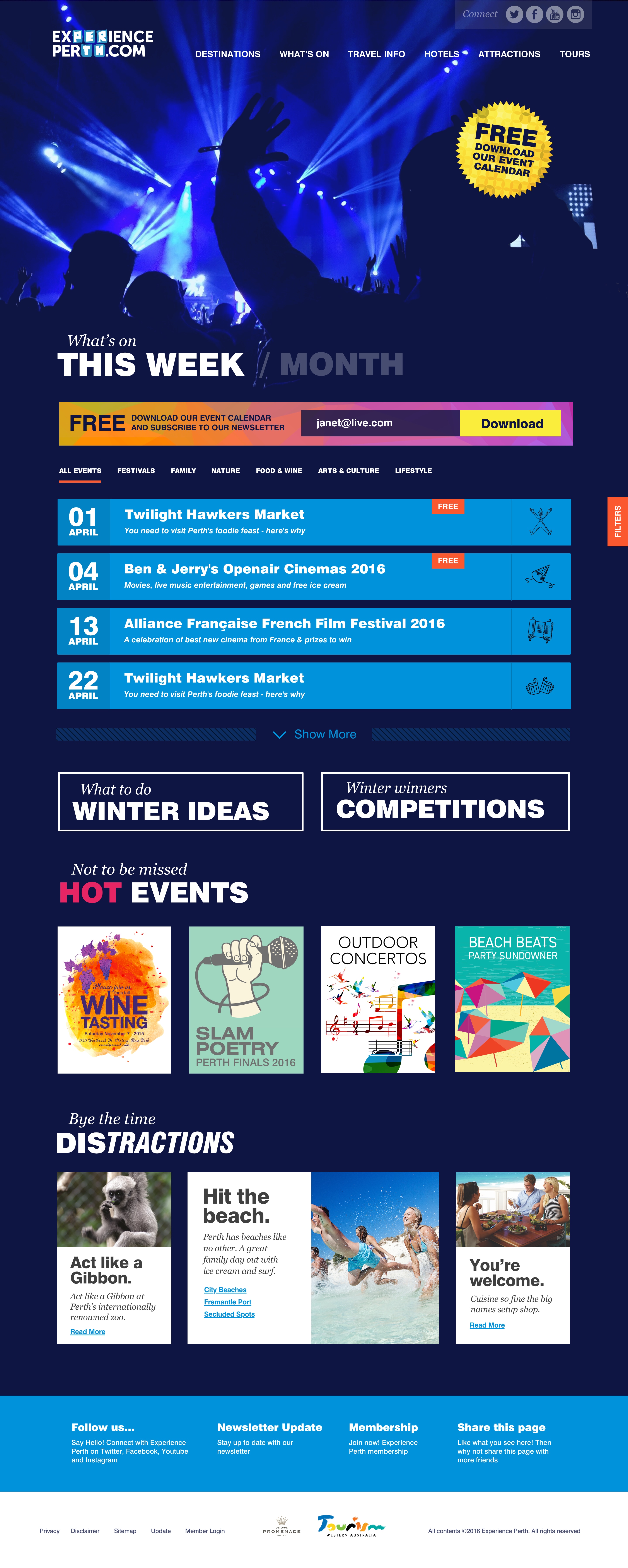 Some initial designs for Experience Perth (WA Tourism) landing pages. Basically made up a lot of the content for Events (posters, article titles, etc) – quite fun and pleased with the results.