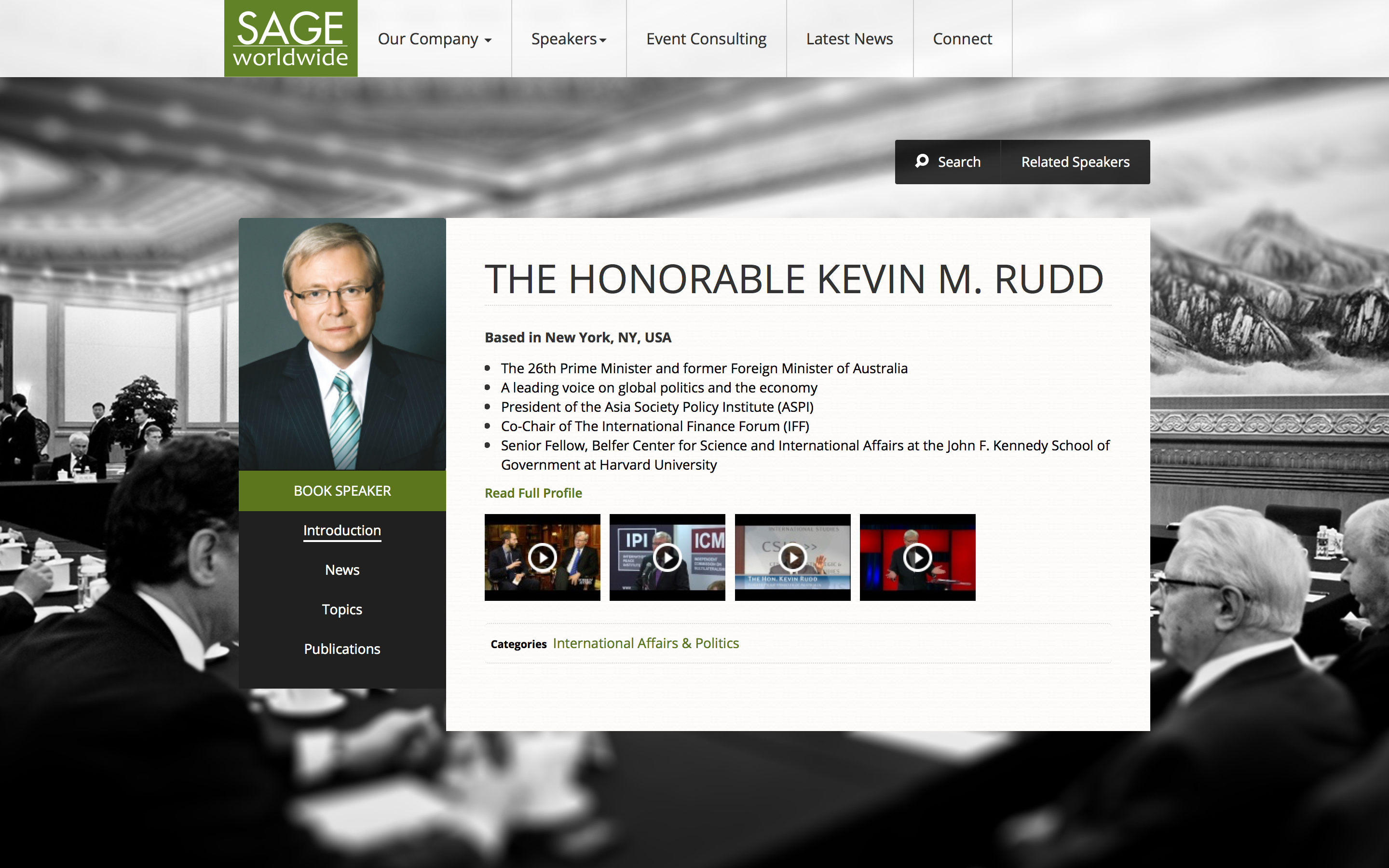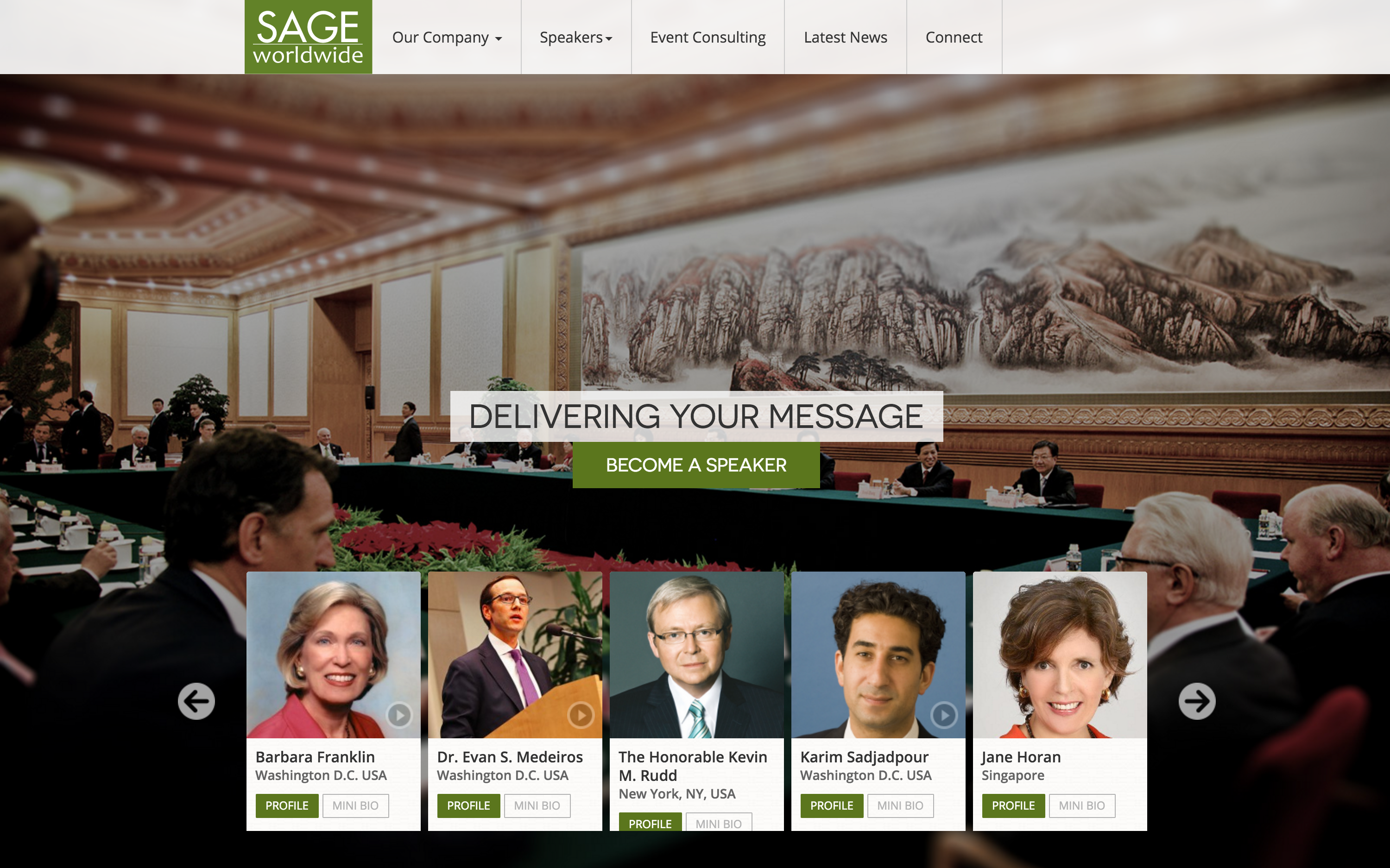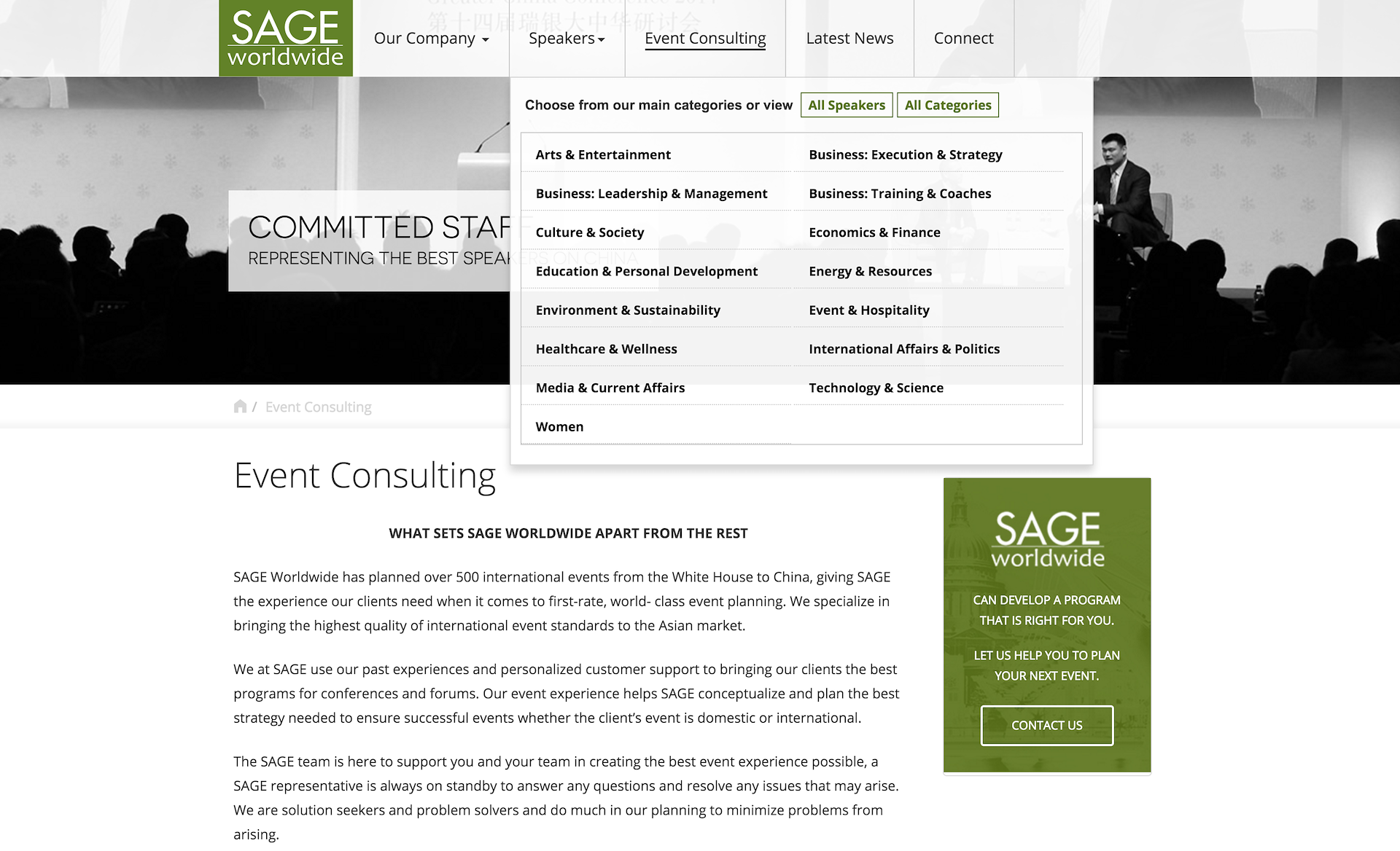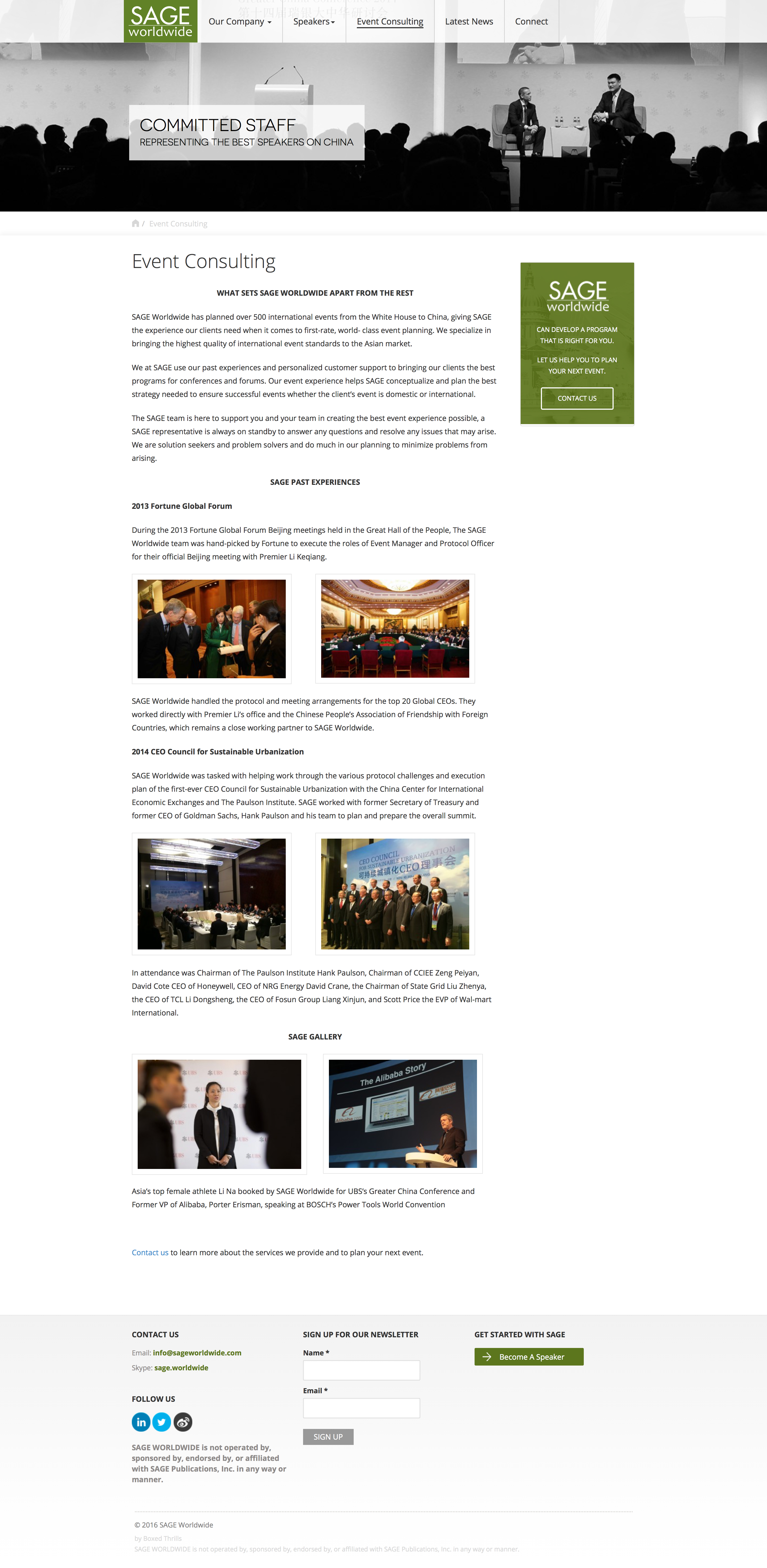 Event and consulting website in with a custom content type to serve the speaker data. Speakers are tagged across news and easily searchable.